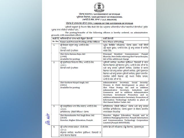 ਚੰਡੀਗੜ੍ਹ, 7 ਫਰਵਰੀ- ਪੰਜਾਬ ਸਰਕਾਰ ਨੇ ਪ੍ਰਸ਼ਾਸਨਿਕ ਅਧਿਕਾਰੀਆਂ ਦੇ ਤਬਾਦਲੇ ਕੀਤੇ ਹਨ। ਤਬਾਦਲਿਆਂ ਦੇ ਵੇਰਵੇ ਇਸ ਪ੍ਰਕਾਰ ਹਨ...