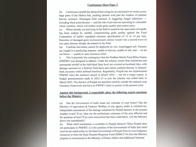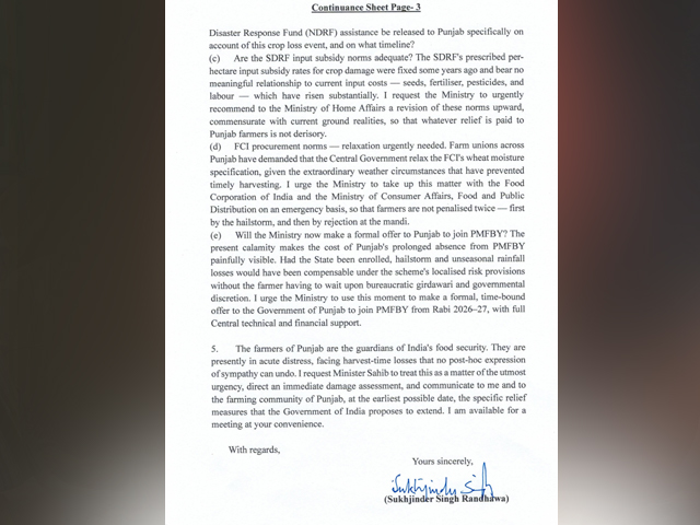 ਗੁਰਦਾਸਪੁਰ, 5 ਅਪ੍ਰੈਲ- ਗੁਰਦਾਸਪੁਰ ਤੋਂ ਸੰਸਦ ਮੈਂਬਰ ਤੇ ਪੰਜਾਬ ਕਾਂਗਰਸ ਦੇ ਸੀਨੀਅਰ ਲੀਡਰ ਸੁਖਜਿੰਦਰ ਸਿੰਘ ਰੰਧਾਵਾ ਨੇ ਕੇਂਦਰੀ ਖੇਤੀਬਾੜੀ ਮੰਤਰੀ ਸ਼ਿਵਰਾਜ ਸਿੰਘ ਚੌਹਾਨ ਨੂੰ ਪੱਤਰ ਲਿਖ ਕੇ ਮੰਗ ਕੀਤੀ ਹੈ ਕਿ ਪੱਛਮੀ ਗੜਬੜੀ ਕਾਰਨ ਪੰਜਾਬ ਵਿਚ ਪਏ ਬੇਮੌਸਮੀ ਮੀਂਹ ਕਾਰਨ ਕਿਸਾਨਾਂ ਦੀਆਂ ਫਸਲਾਂ ਨੂੰ ਕਾਫੀ ਨੁਕਸਾਨ ਹੋਇਆ ਹੈ। ਇਸ ਲਈ ਕੇਂਦਰ ਦਖਲ ਦੇ ਕੇ ਕਿਸਾਨਾਂ ਨੂੰ ਇਸ ਮੁਸ਼ਕਲ ਦੀ ਘੜੀ ਵਿਚ ਰਾਹਤ ਪ੍ਰਦਾਨ ਕਰੇ।