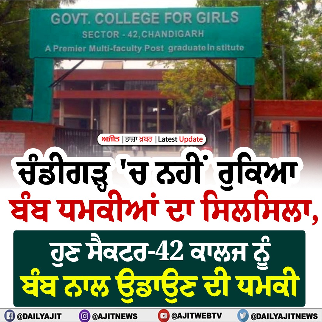 ਚੰਡੀਗੜ੍ਹ 'ਚ ਨਹੀਂ ਰੁਕਿਆ ਬੰਬ ਧਮਕੀਆਂ ਦਾ ਸਿਲਸਿਲਾ, ਹੁਣ ਸੈਕਟਰ-42 ਕਾਲਜ ਨੂੰ ਬੰਬ ਨਾਲ ਉਡਾਉਣ ਦੀ ਧਮਕੀ